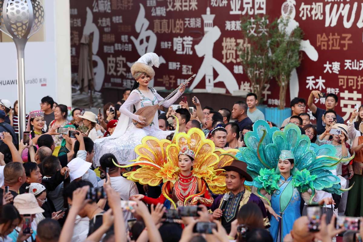 Performers in traditional ethnic attire dance for visitors at the Xinjiang International Grand Bazaar in Urumqi, Xinjiang Uygur autonomous region, on Sept 8, 2025. The bazaar has received an average of more than 200,000 daily tourists since July. [Photo by Zhu Xingxin/chinadaily.com.cn]