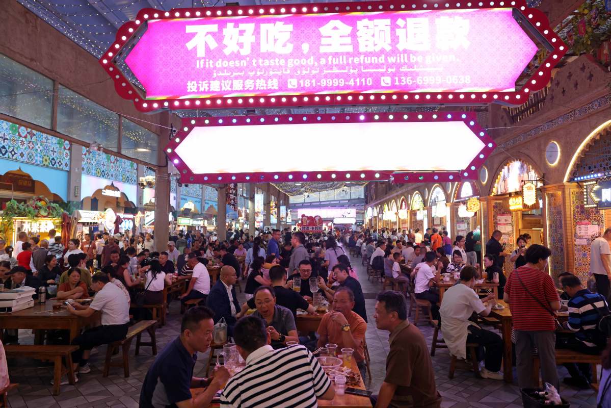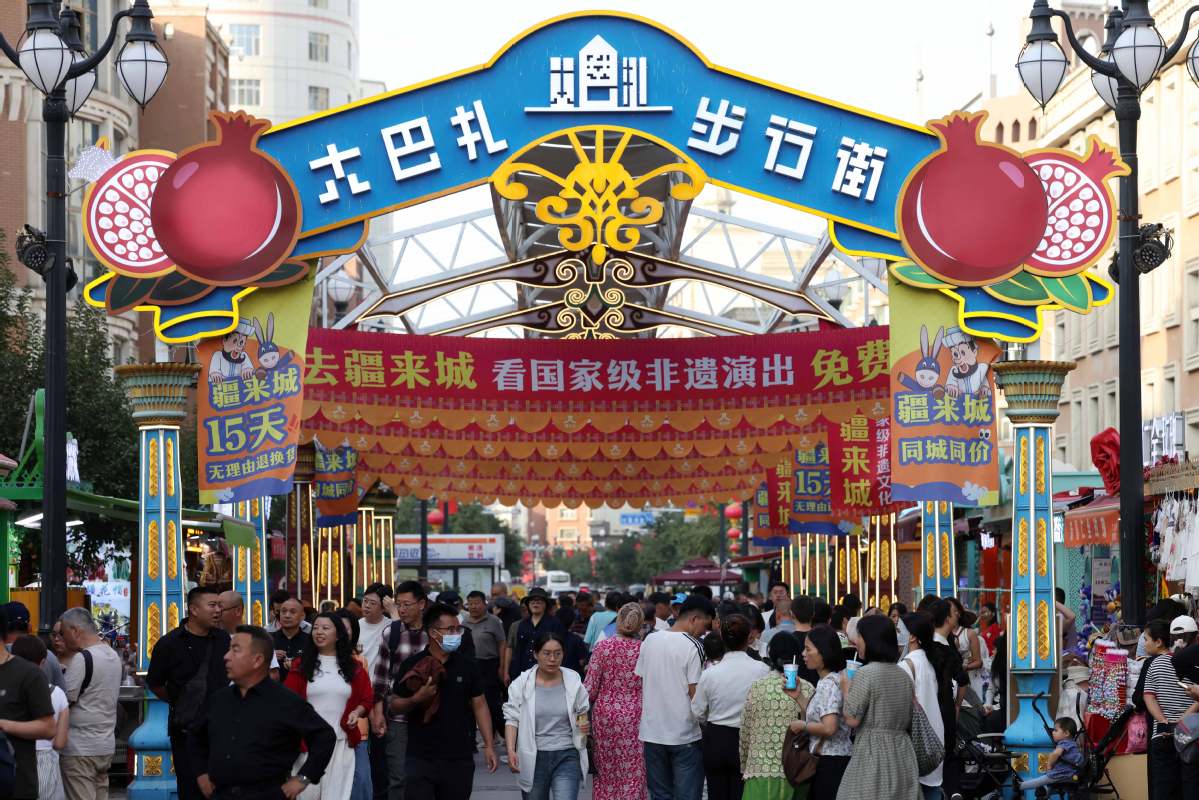 Tourists explore the Xinjiang International Grand Bazaar in Urumqi, Xinjiang Uygur autonomous region, on Sept 8, 2025. The bazaar has received an average of more than 200,000 daily tourists since July. [Photo by Zhu Xingxin/chinadaily.com.cn]