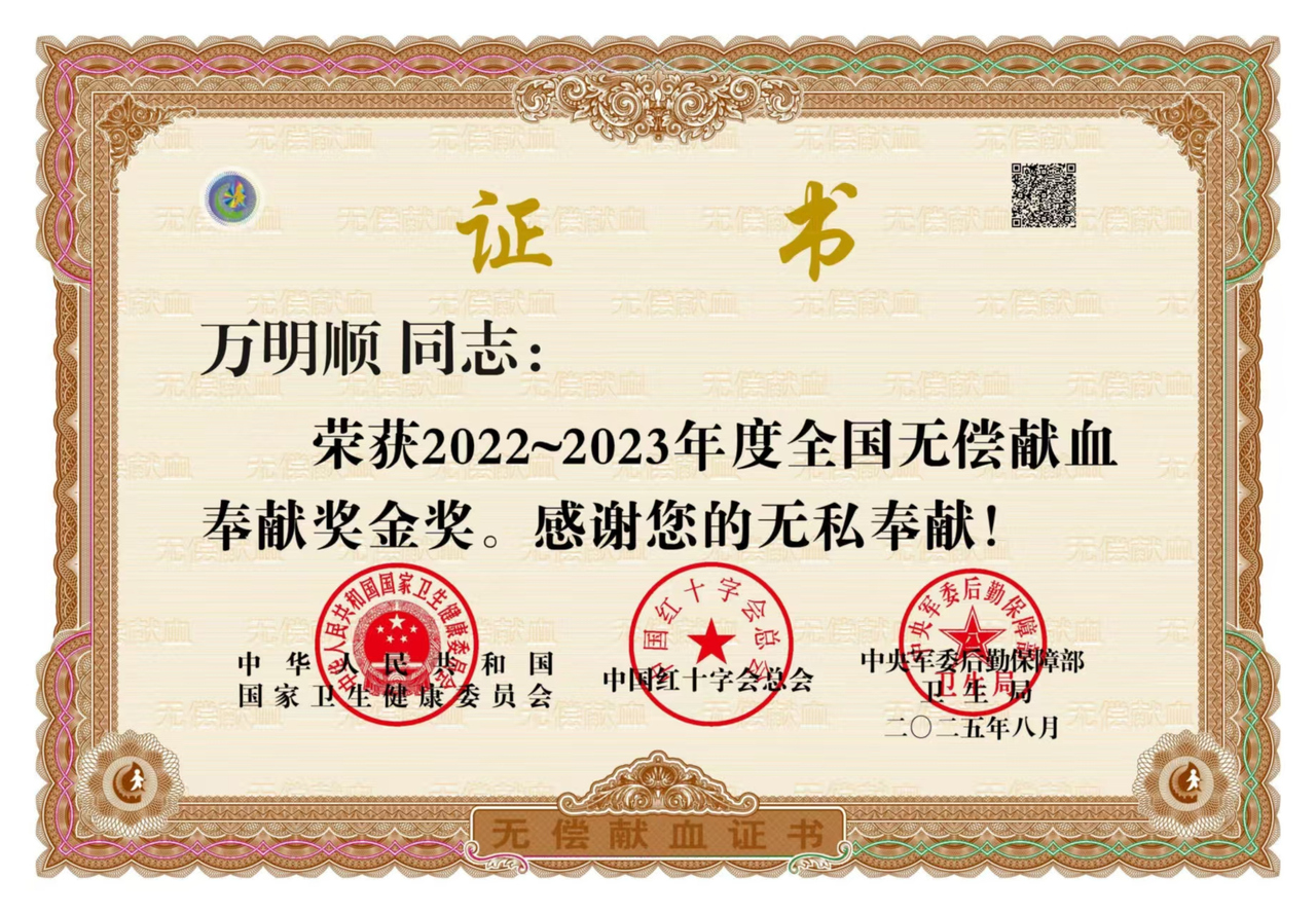 50多歲的萬明順是位愛做公益的獻血達人,2022年至2024年,他每年獻血20次以上,至今已累計參與無償獻血93次,獻血量達25700ml,相關事跡數次登上熱搜。此外,他還獲得2020-2021年度全國無償獻血奉獻獎銅獎,2022-2023年度全國無償獻血奉獻獎金獎。