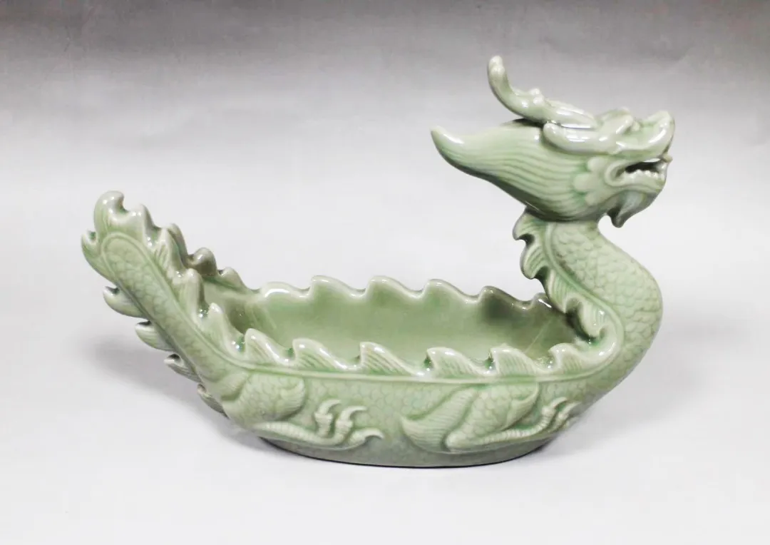 “秘色瓷貼塑龍型洗”以五代三爪龍為設計原型,整體為龍形,龍頭處向上,腹部貼塑四肢三爪龍三爪腳,龍身布滿鱗片,雕塑成舟,有蒼龍出海的意境,傳承龍舟拼搏奮進,力爭上游的精神。