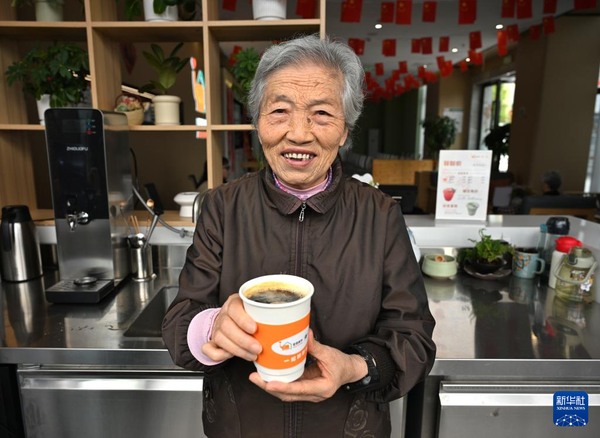 10月9日,在“忘不了”咖啡廳,周奶奶向記者展示制作好的咖啡。