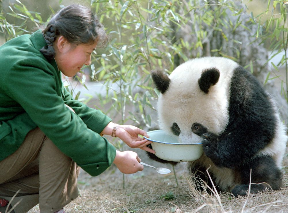 1980年,飼養員給即將送往德國的大熊貓“寶寶”喂牛奶。
